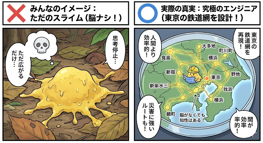 はじめに 森の朽ち木や落ち葉の裏にいる、黄色くてドロドロした生物、「粘菌(変形菌)」。 見た目はただのスライムやカビのようで、脳みそもなければ、神経すらありません。 ただの単細胞生物です。 しかし、もし彼らに「都市設計(インフラ整備)」を任... 実は、『驚き』