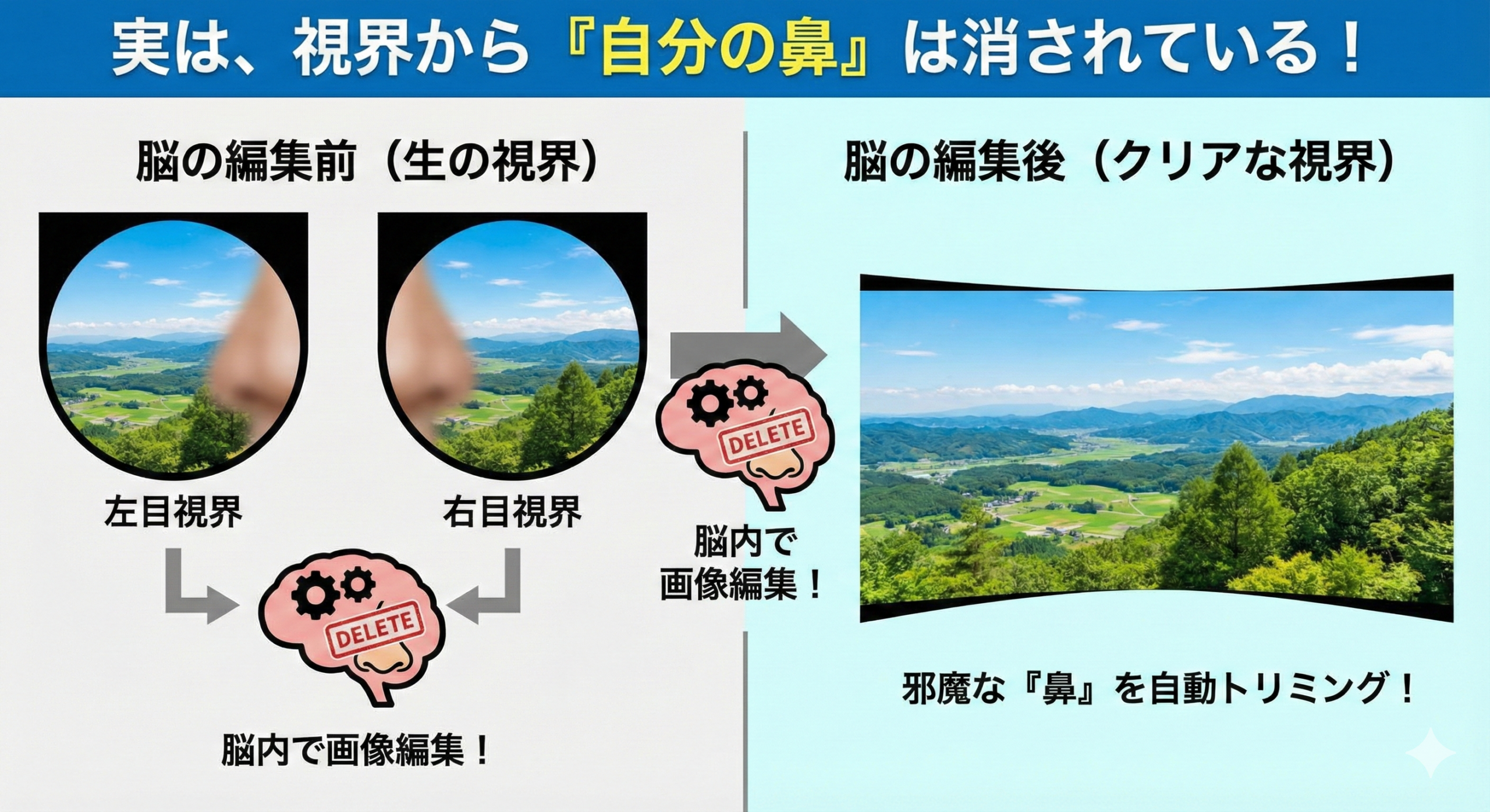 これは、脳が「鼻は邪魔だから消しておこう」と、自動でトリミング(削除)処理をしてくれているからです。