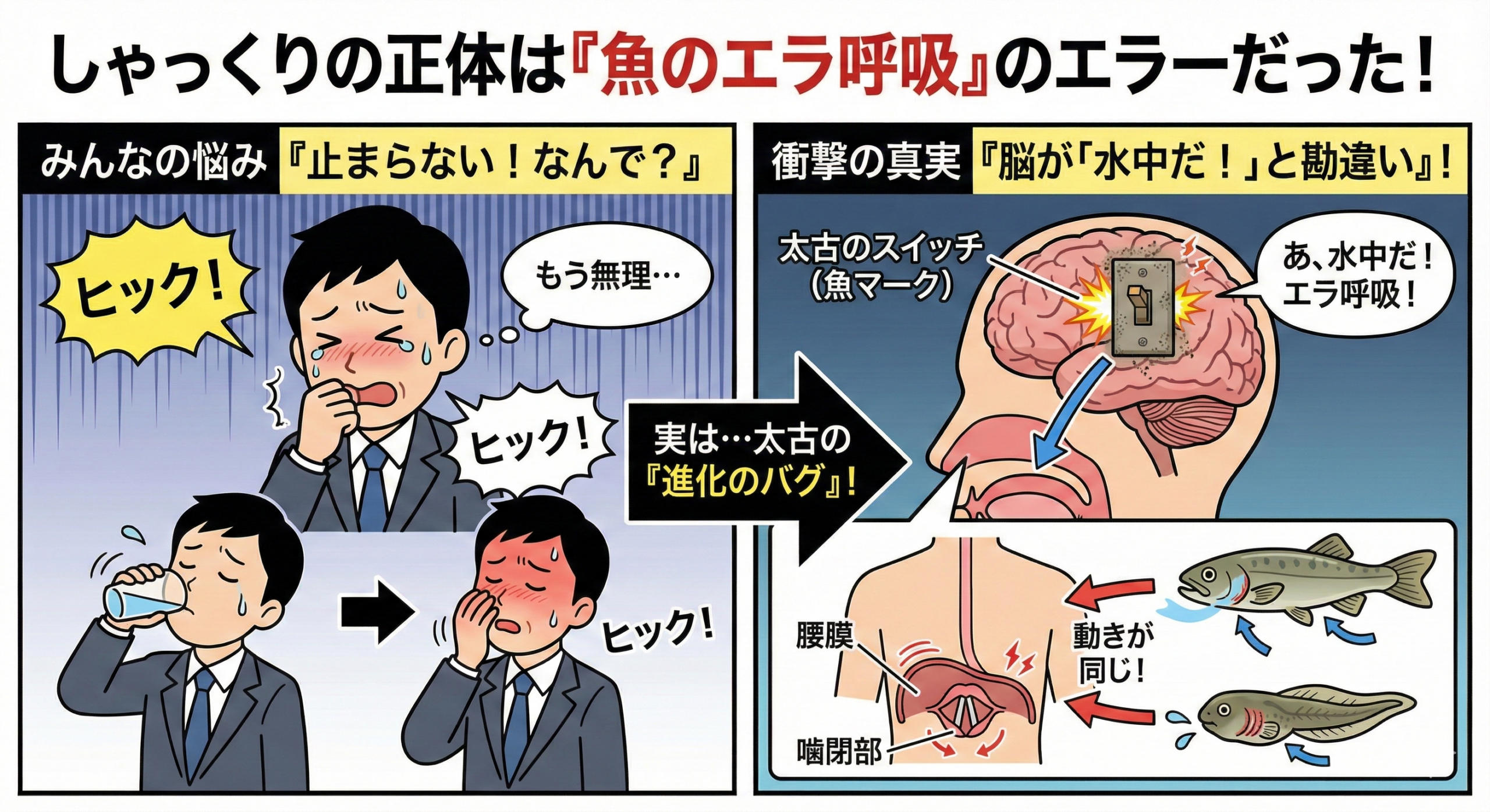 人間は進化の過程でエラ呼吸を捨てましたが、脳の奥深くにある「エラ呼吸用の神経回路」だけは完全には消えず、配線が残ってしまいました。 何かの拍子にその古いスイッチが誤作動を起こすと、脳が「あ、水中だ! エラ呼吸しなきゃ!」と勘違いして、しゃっくりを引き起こすのです。
