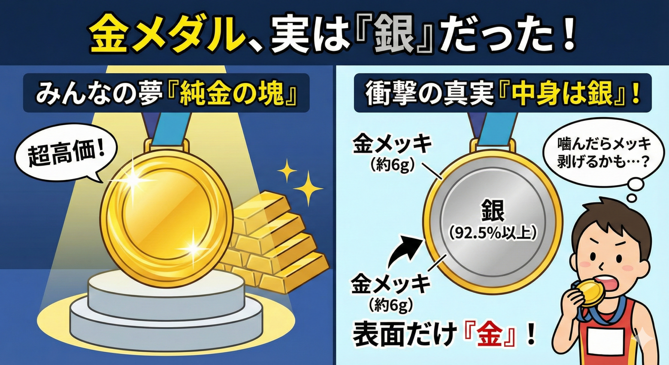 つまり、重さが500g以上あるメダルのうち、「金」の部分はわずか6g程度。残りの数百グラムはすべて「銀」なのです。 名称こそ「金メダル」ですが、実態は「最高級・銀メダル(金ラッピング仕様)」と言った方が正確かもしれません。