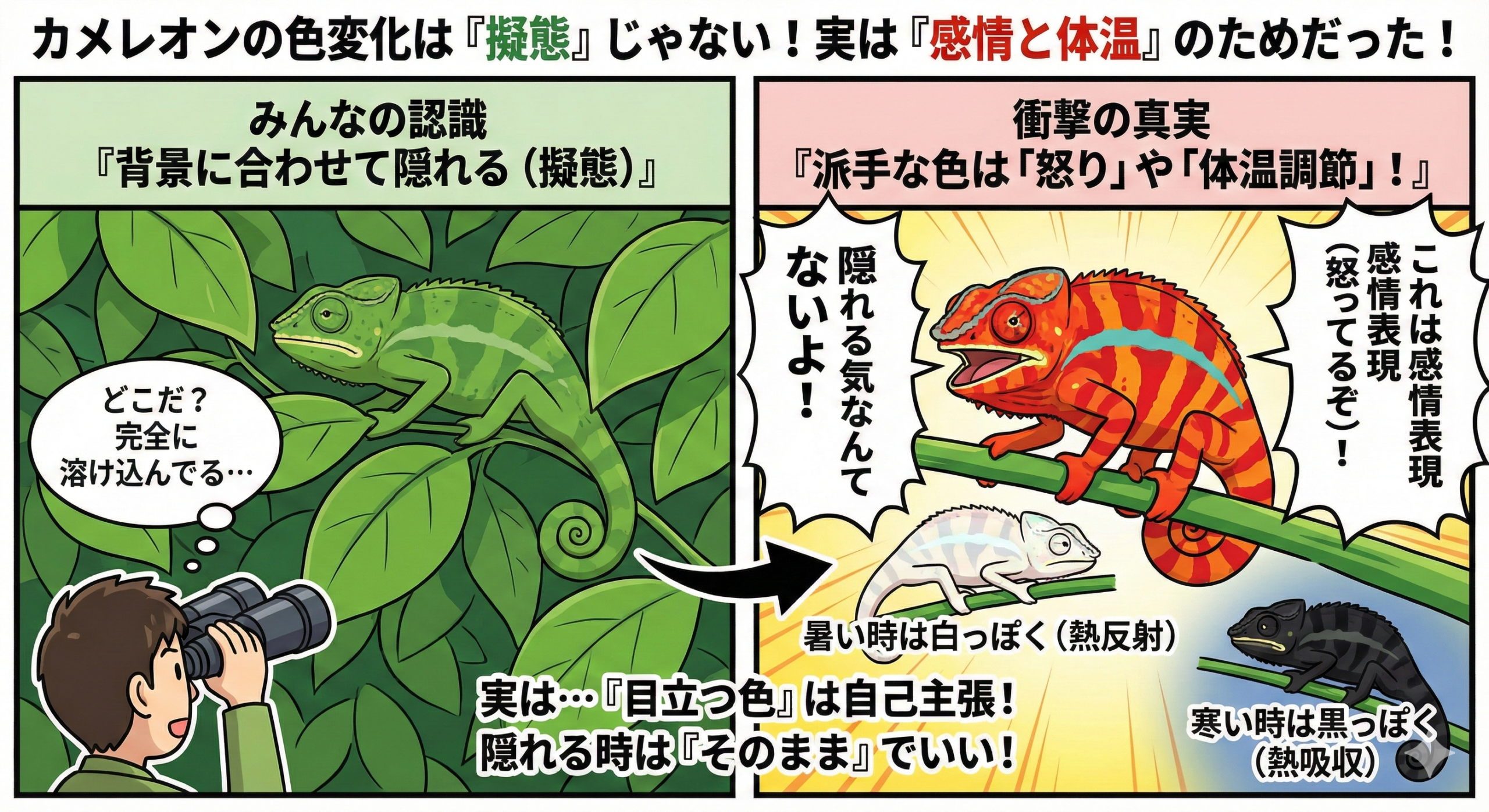 つまり、森の中で派手な色になっているカメレオンは、隠れるどころか「俺は今、怒ってるぞー!」と自己主張している状態なのです。