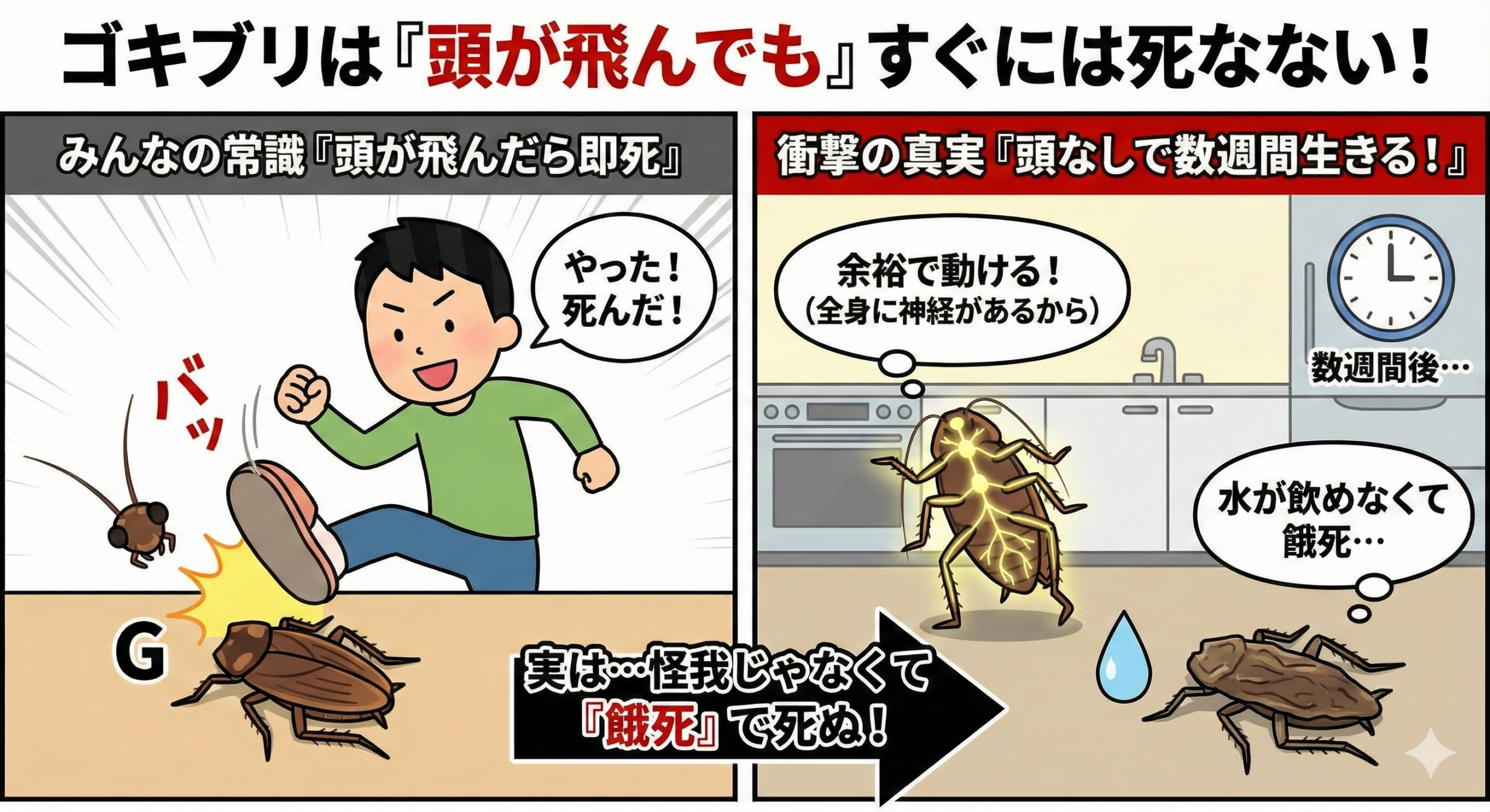 人類の敵、ゴキブリ(G)。 彼らの生命力は異常ですが、その最たる例が「頭部」の話です。