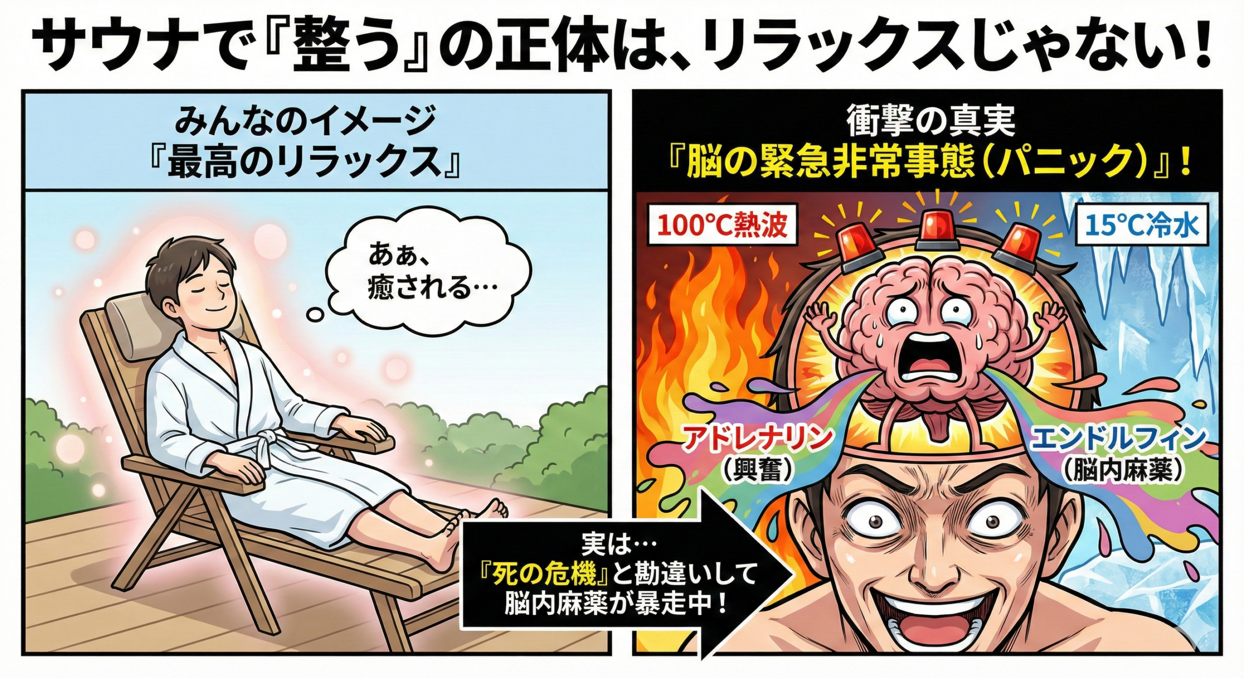 自律神経はパニックになり、アドレナリン(興奮物質)を大量放出して心臓を叩き起こそうとします。 その直後に休憩(外気浴)することで、危機が去ったと判断し、今度はエンドルフィン(快楽物質・脳内麻薬)を出して鎮痛・鎮静を図ります。