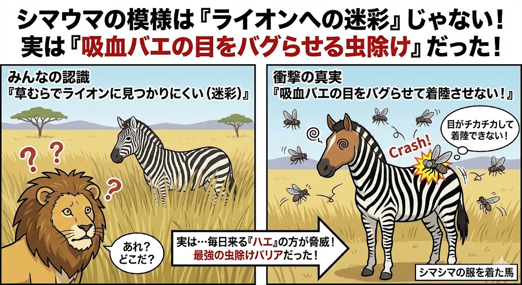 シマウマにとって、たまに来るライオンよりも、毎日大量に襲ってきて病気を媒介するハエの方が生存に関わる脅威だったのです。 あの模様は、「最強の虫除けバリア」でした。