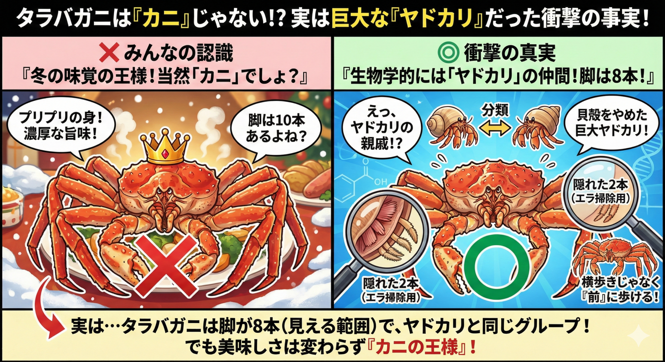 今度カニ鍋を囲む時は、ぜひ「こいつ、実はヤドカリなんだぜ…」と披露して、場の話題をさらってみてください。