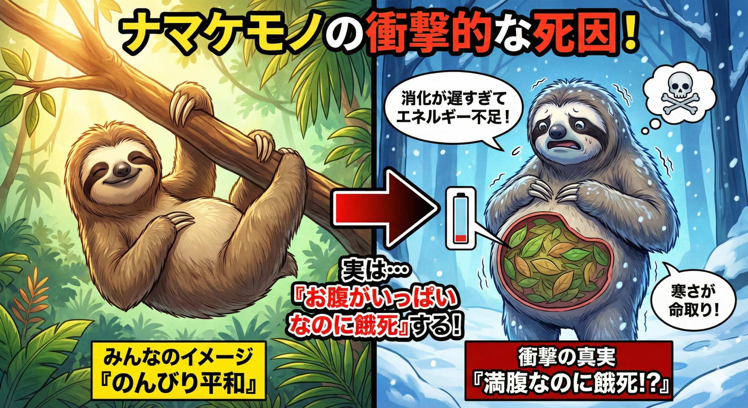 「怠けている」と言われますが、彼らはギリギリのエネルギー収支で生きている究極の省エネ生物。 寒さは彼らにとって、まさに命取りなのです