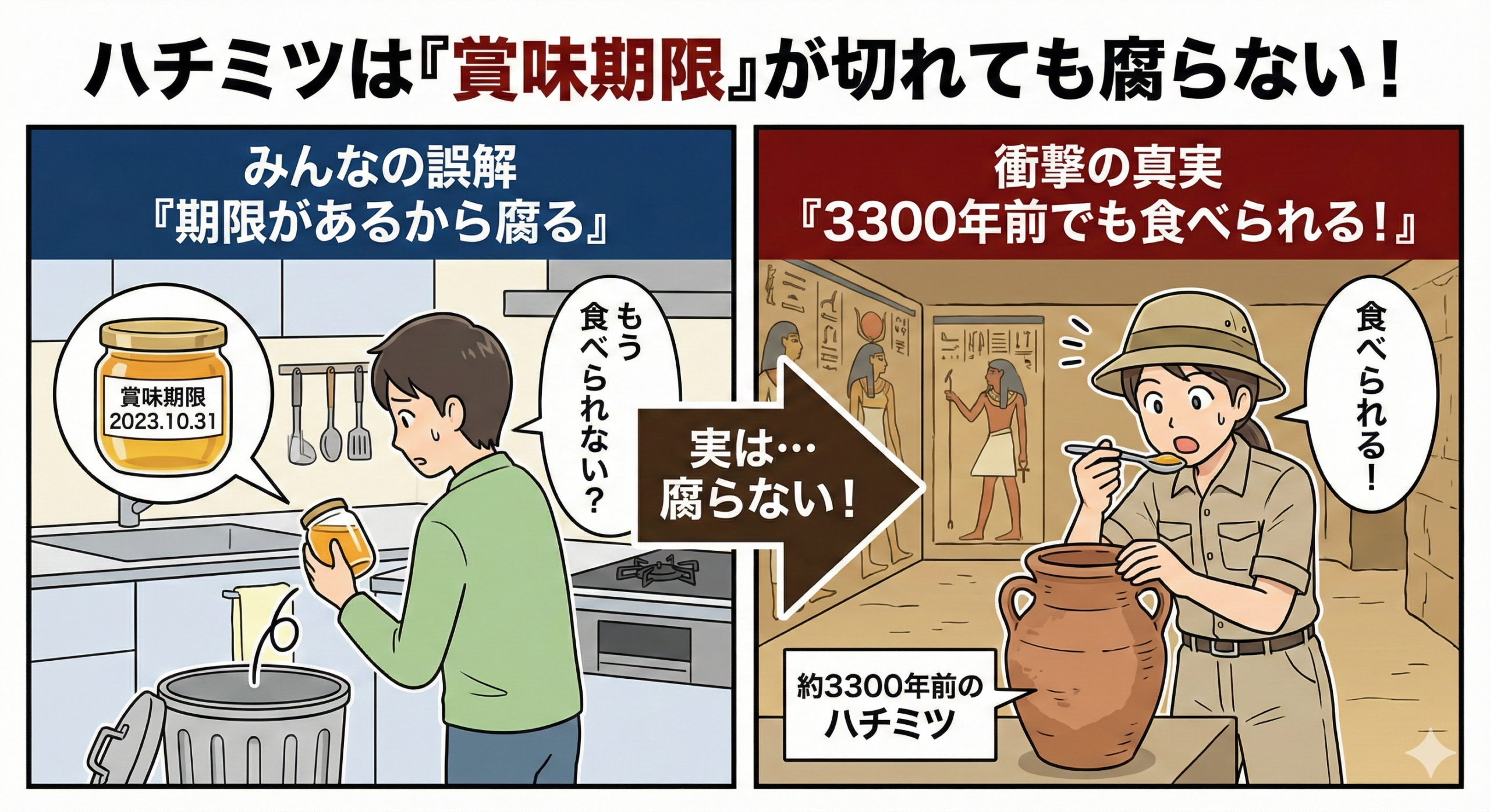 実は、ハチミツには「賞味期限」がない。3000年前のものでも食べられる