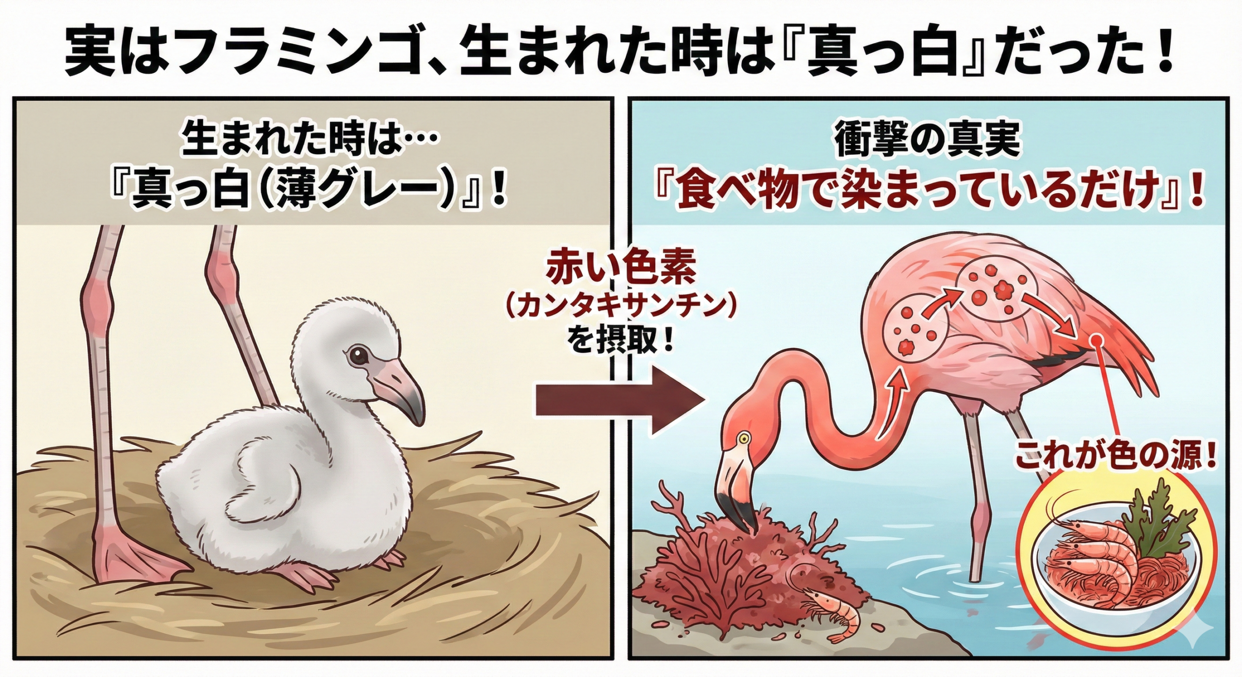 「フラミンゴ=ピンク色」というのが常識ですが、 「実はフラミンゴ、生まれた時は真っ白(または灰色)で、ピンク色は後天的なもの」 だということをご存知でしょうか?