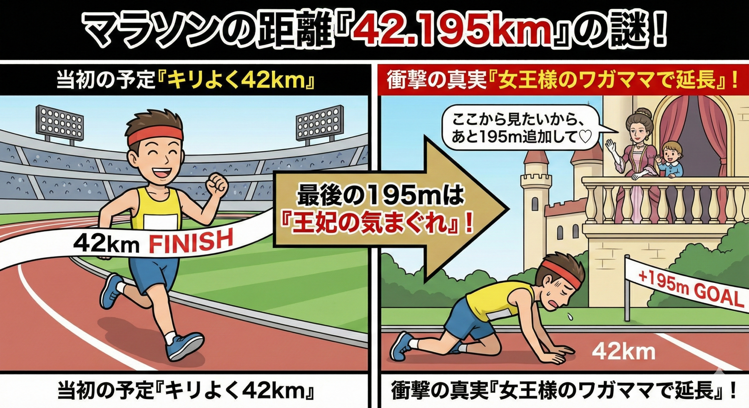世界中のランナーが苦しんでいる最後の195メートル。 あれは、100年以上前の「孫にいいとこ見せたいおばあちゃん(王妃)」の気まぐれによって生まれた距離だったのです。 そう思うと、ラストスパートの辛さも少し……いや、余計に腹が立つかもしれませんね。