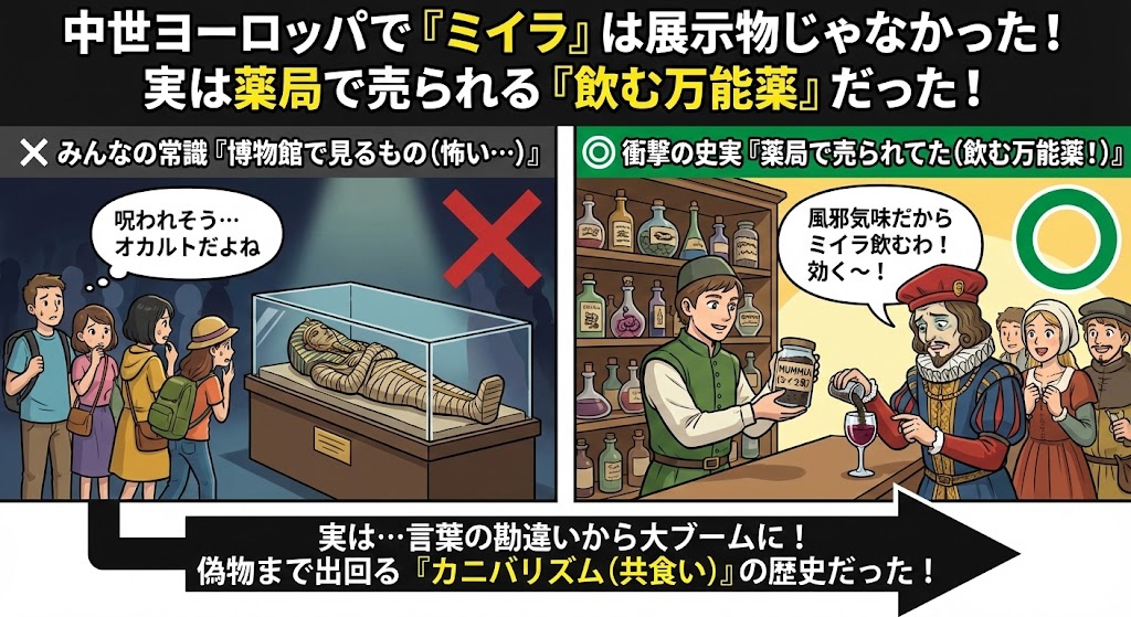 しかし、中世から近代にかけてのヨーロッパでは、ミイラは見るものではなく、 「食べるもの(薬)」 として扱われていました。