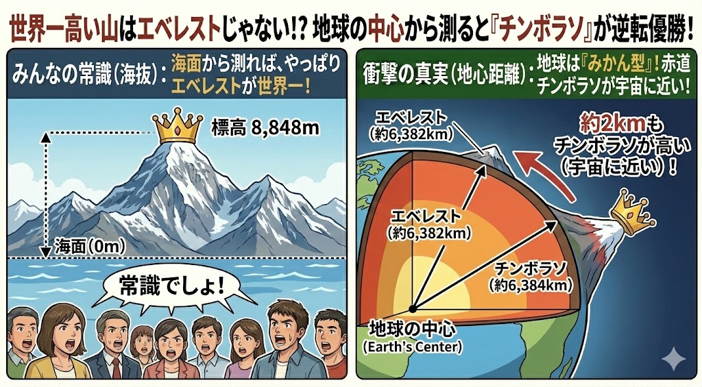 確かに、「海面(海抜)」から測ればエベレストが世界一です。 しかし、もし基準を「海」ではなく、「地球の中心からの距離(どちらがより宇宙に近いか)」に変えると、順位が劇的に変わることをご存知でしょうか?