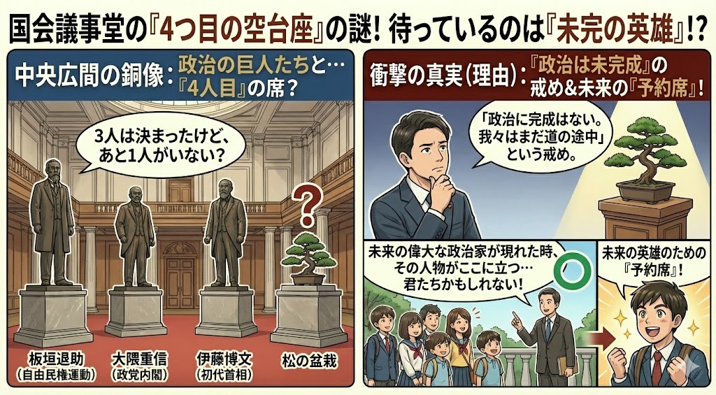 堅苦しい国会議事堂の中に、こんな「余白(遊び心)」があるなんて素敵ですよね。 もし国会見学に行く機会があったら、3人の偉人だけでなく、 「ここが俺の指定席か……」 と、4つ目の台座を眺めて野望を抱いてみるのも面白いかもしれません