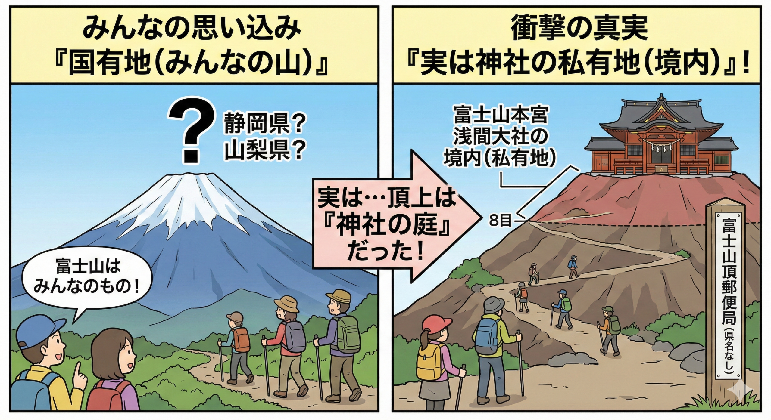 「実は、富士山の頂上は、山梨県でも静岡県でもありません」 あそこは、日本の地図上で「県境が存在しない場所」なのです。