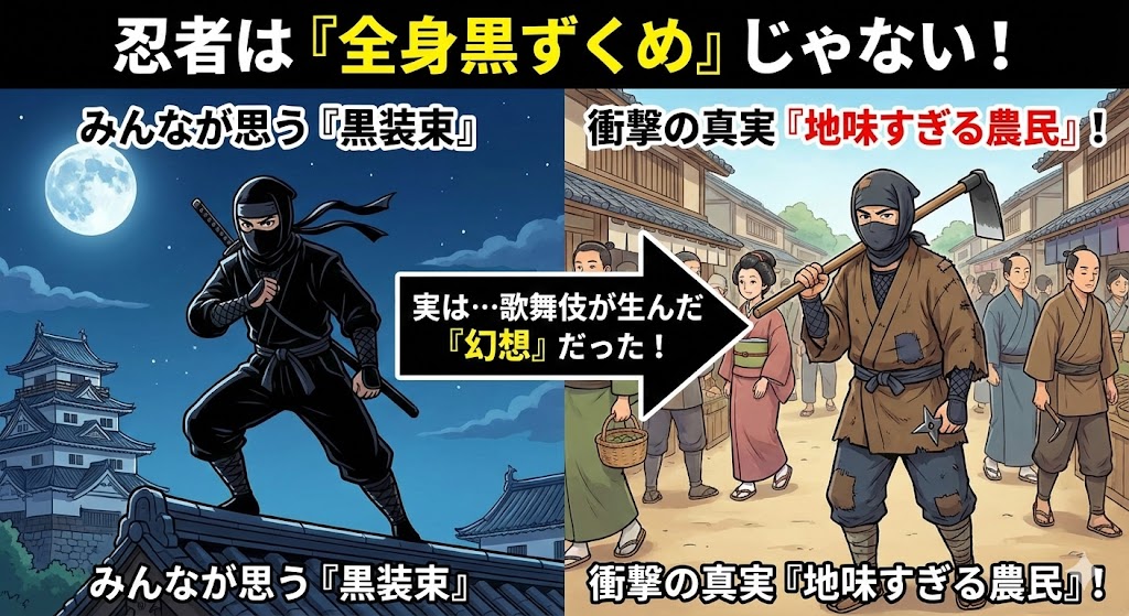 私たちが知っている「黒装束の忍者」は、歌舞伎で黒子(裏方)が突然武器を出して戦うとかっこいい、という「舞台演出」から生まれたフィクションでした。 本物の忍者は、あなたの隣にいる地味な服装のおじさんだったのかもしれません。