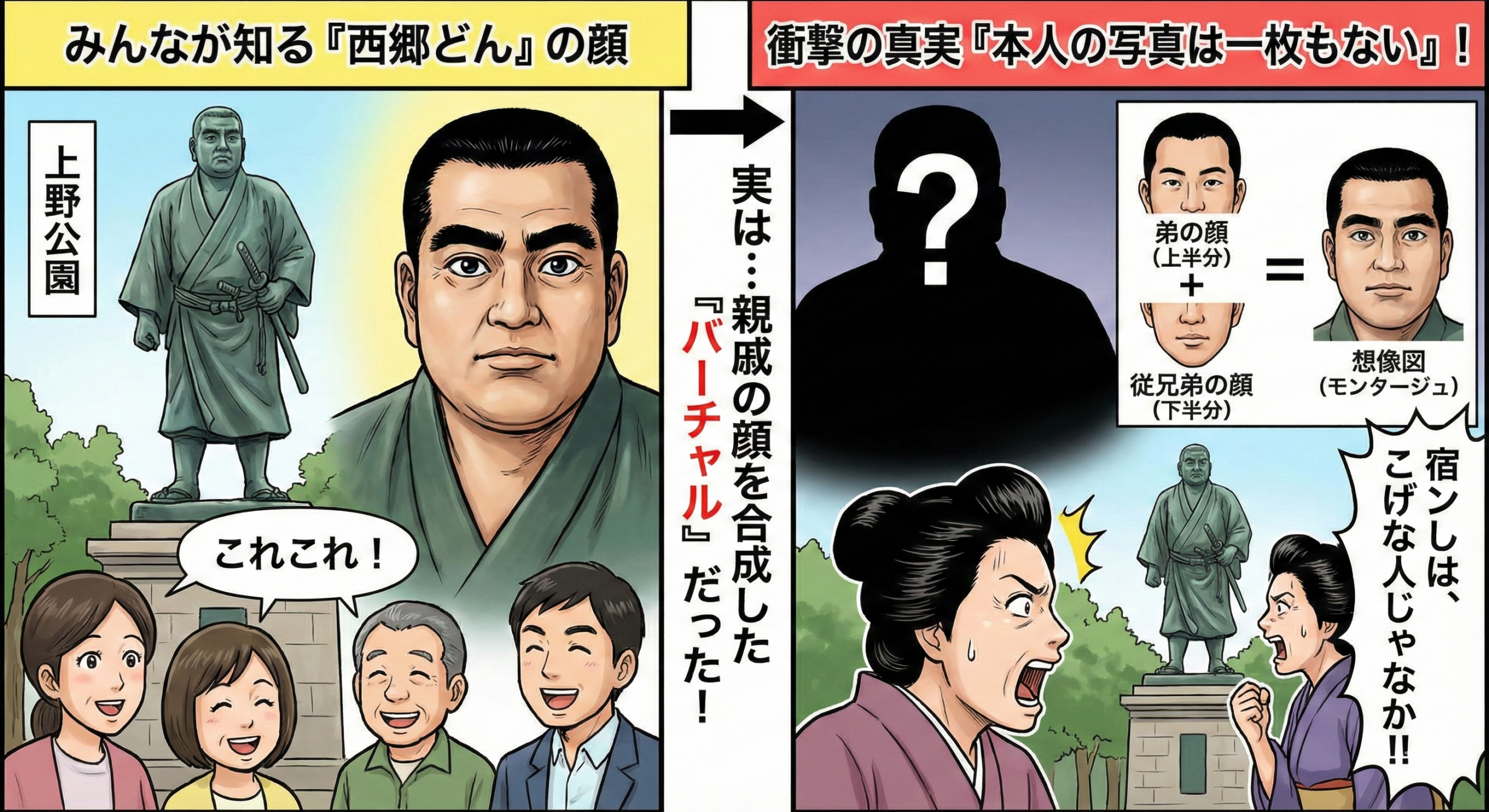 私たちが「西郷どん」として親しんでいるあの顔は、親戚の顔を継ぎ接ぎして作った「バーチャル・サイゴウ」でした。 本物の西郷さんがどんな顔をしていたのか、それは歴史の闇の中です。