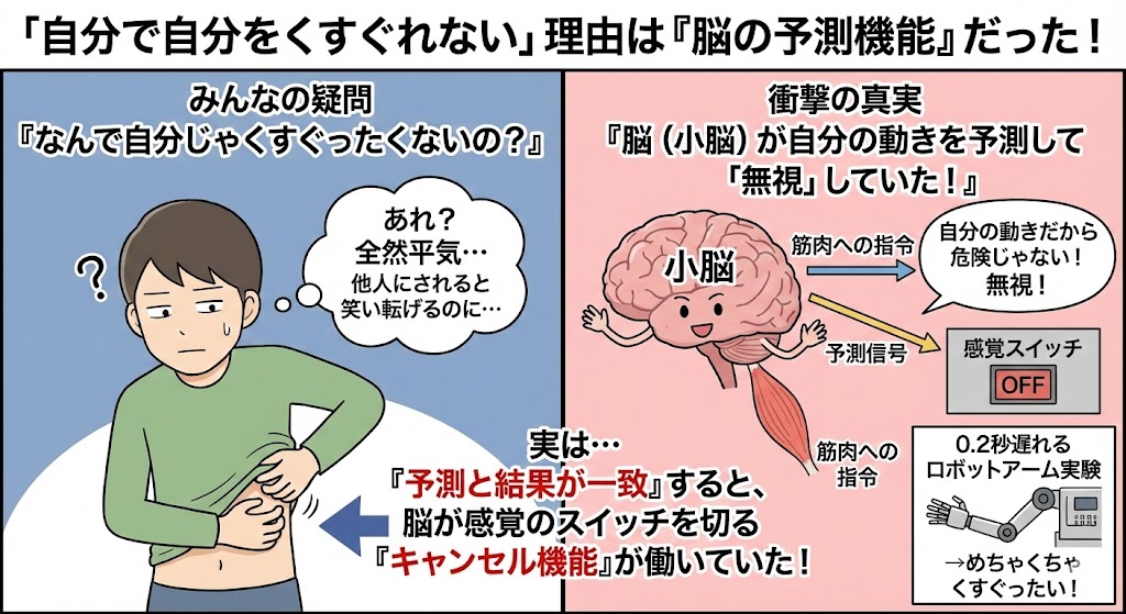 実は脳(小脳)が、自分の動きを完璧に予測して、感覚を「無視」しているからです。