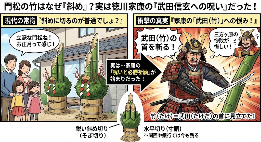 お正月に門松を見かけたら、竹の切り口をチェックしてみてください。 もし斜めに切られていたら、「ああ、家康さんがブチ切れた跡だな……」と歴史のドラマを感じてみてください。