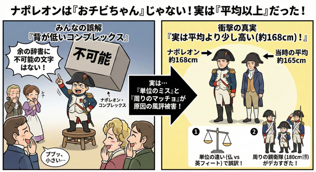 「余の辞書に不可能という文字はない」で有名な英雄ナポレオン。 彼は背が低いことへのコンプレックスを持っていた、というのが通説ですよね。 「ナポレオン・コンプレックス」という言葉まであるくらいです。 しかし、実際の彼の身長は約168〜169cm。当時... -