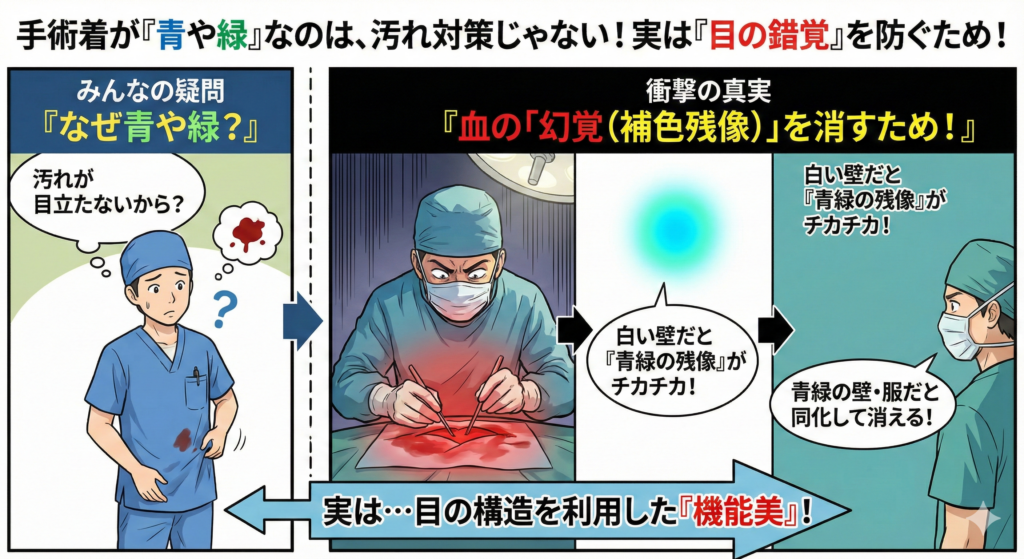 実は、手術着が「青緑色」なのは、医者の「目の錯覚」を防ぐため