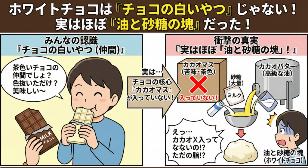 甘くてクリーミーなホワイトチョコレート。 「チョコの白いやつでしょ?」と思っていますよね。 でも、よく考えてください。チョコの原料である「カカオマス(茶色い苦い部分)」が入っていないのに、なぜチョコなのでしょう? 実はあれ、厳密には「油と砂... -