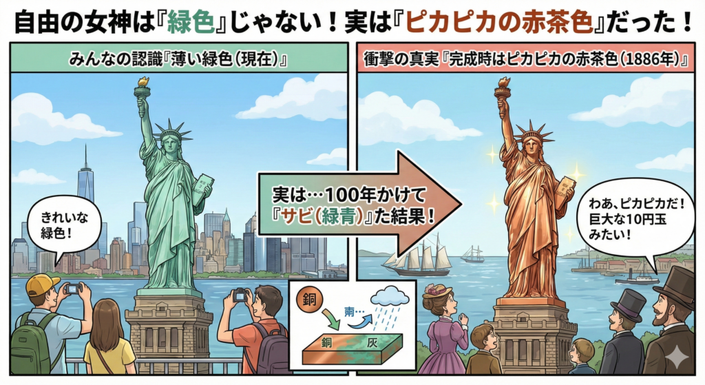 実は、自由の女神は元々「茶色(10円玉の色)」だった