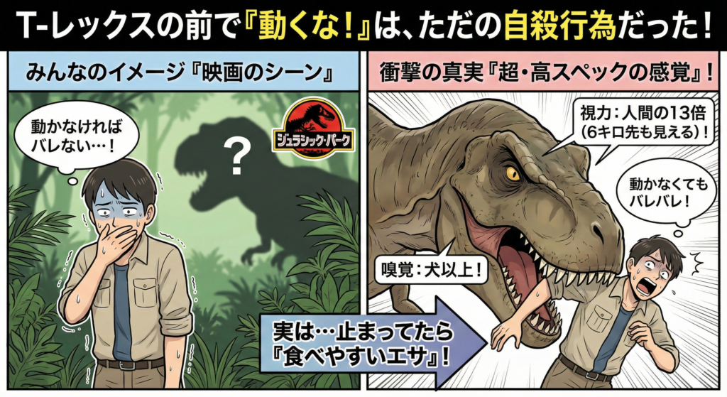 映画『ジュラシック・パーク』の有名なシーン。 ティラノサウルス(T-レックス)の前で、「動くな! 動かなければ奴には見えない!」と息を潜める場面がありますよね。 あれを現実でやったら、0.1秒で食べられて終了です。 視力は人間の「13倍」 最新の研... -