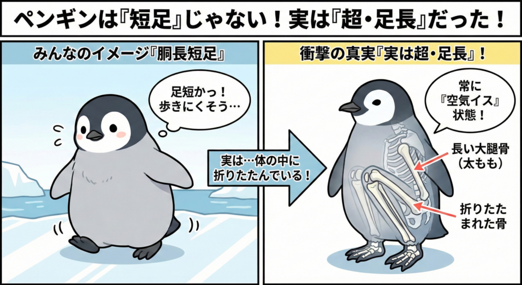 ヨチヨチ歩きが可愛いペンギン。 胴長短足の代名詞みたいな体型をしていますよね。 「足が短くて歩きにくそうだな〜」なんて思っていませんか? 実は彼ら、体の半分が足と言ってもいいくらいの「超・足長」なんです。 常に「空気イス」状態 ペンギンの骨格...