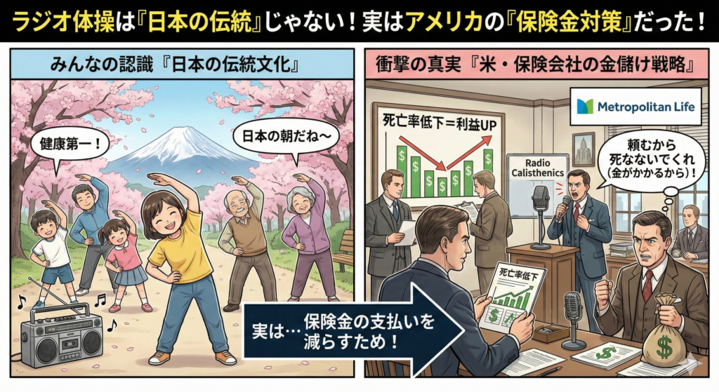 夏休みの朝、日本人の体に染み付いている「ラジオ体操」。 これぞ日本の伝統文化!という感じがしますが、起源は日本ではありません。 実は、アメリカの「生命保険会社」が、保険金の支払いを減らすために作ったものでした。 メトロポリタン生命の戦略 192... -