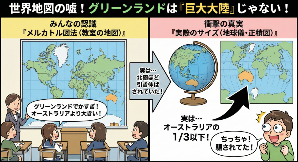 はじめに 学校の教室や、ニュースの背景でよく見る「世界地図」。 一番北の方に、真っ白で巨大な島「グリーンランド」がありますよね。 地図上で見ると、南にある「アフリカ大陸」や「南米大陸」と同じくらいの、ものすごい存在感を放っています。 「グリ... -