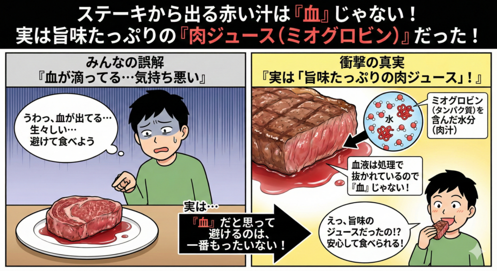 実は、ステーキの赤い汁は「血」ではない!レア肉が赤く見える正体は「ミオグロビン」