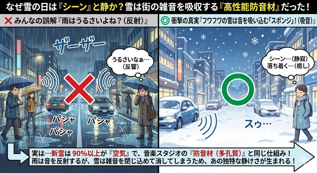 はじめに 冬の夜、ふと外に出ると。 「あれ? なんだか今日は、妙に静かだな……」 と思って空を見上げると、雪が降っていた。そんな経験はありませんか? この**「雪の日の静寂(シーンとしている感じ)」。 単に人が出歩いていないから静かなのではなく、... -