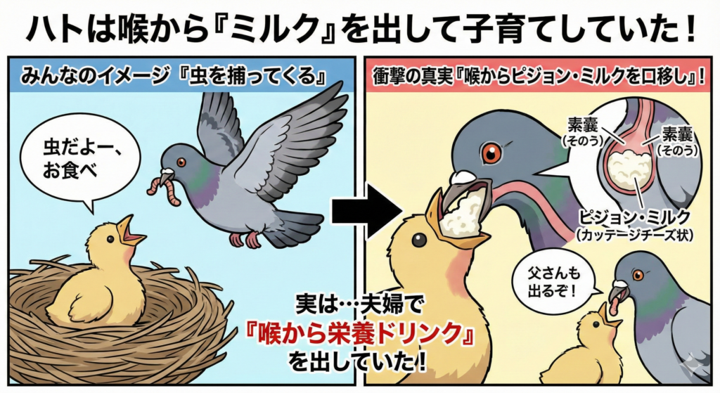 実は、ハトは口から「ミルク」を吐き出して子育てをする(しかもオスも!)