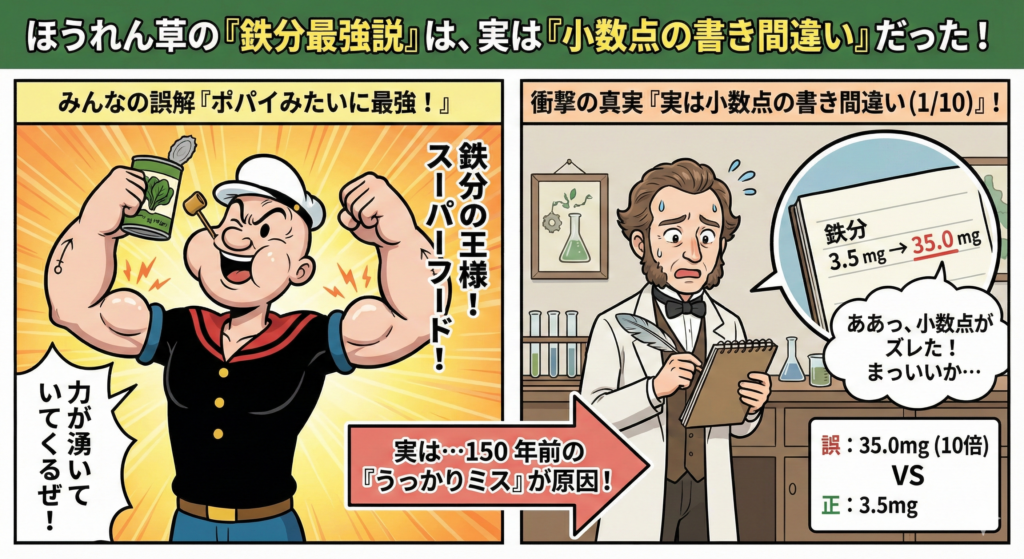 「ほうれん草を食べると力が湧く!」 ポパイのアニメの影響もあり、ほうれん草は鉄分の王様だと思われています。 実はあれ、昔の研究者が「小数点の位置」を書き間違えて、数値を「10倍」にしてしまったミスが発端なんです。 100年信じられた誤解 1870年、... -