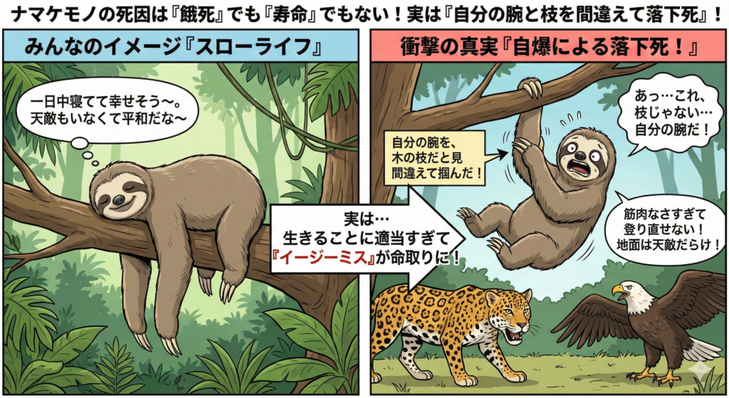 究極の省エネ動物、ナマケモノ。 一日中木にぶら下がって動かない彼らですが、時々うっかり死んでしまうことがあります。 その理由があまりにもドジっ子すぎます。 「自分の腕を、掴まるべき木の枝だと見間違えて掴んでしまい、支えを失って落ちる」のです... -