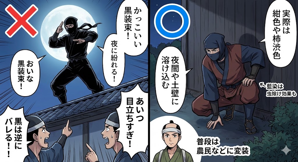はじめに 日本が世界に誇るヒーロー、忍者。 映画やアニメでは、頭巾をかぶり、全身「真っ黒な装束」で闇に紛れる姿がおなじみですよね。 「かっこいい! 夜に紛れるならやっぱり黒だよね!」 と思っているあなた。 実は、本物の忍者は黒い服なんて着てい... -