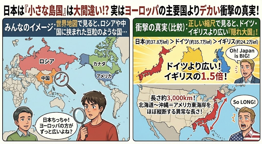 はじめに 私たちは学校やニュースで、日本のことをよく「極東の小さな島国」と呼びます。 世界地図(メルカトル図法)をパッと見ると、ロシアやカナダ、アメリカ、中国といった巨大な大陸国家に挟まれて、日本は豆粒のように小さく見えますよね。 「日本な... -