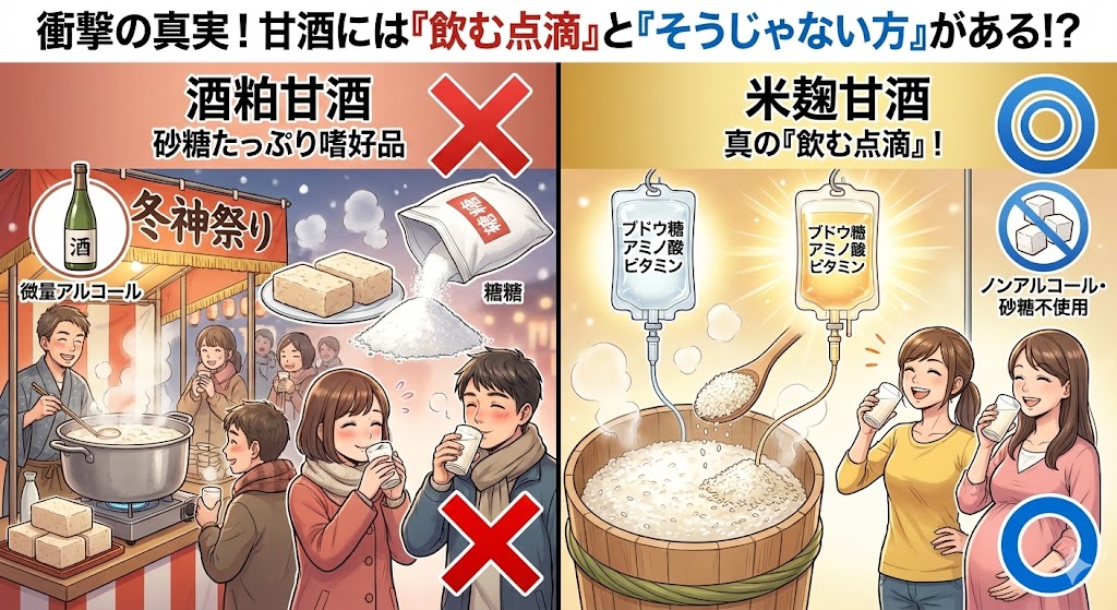 はじめに 初詣や冬の寒い日に飲みたくなる、温かい「甘酒」。 最近は「飲む点滴」とも呼ばれ、美容や健康のために毎日飲んでいるという方も増えています。 しかし、一言で「甘酒」と言っても、スーパーには「酒粕(さけかす)」で作ったものと、「米麹(こ... -