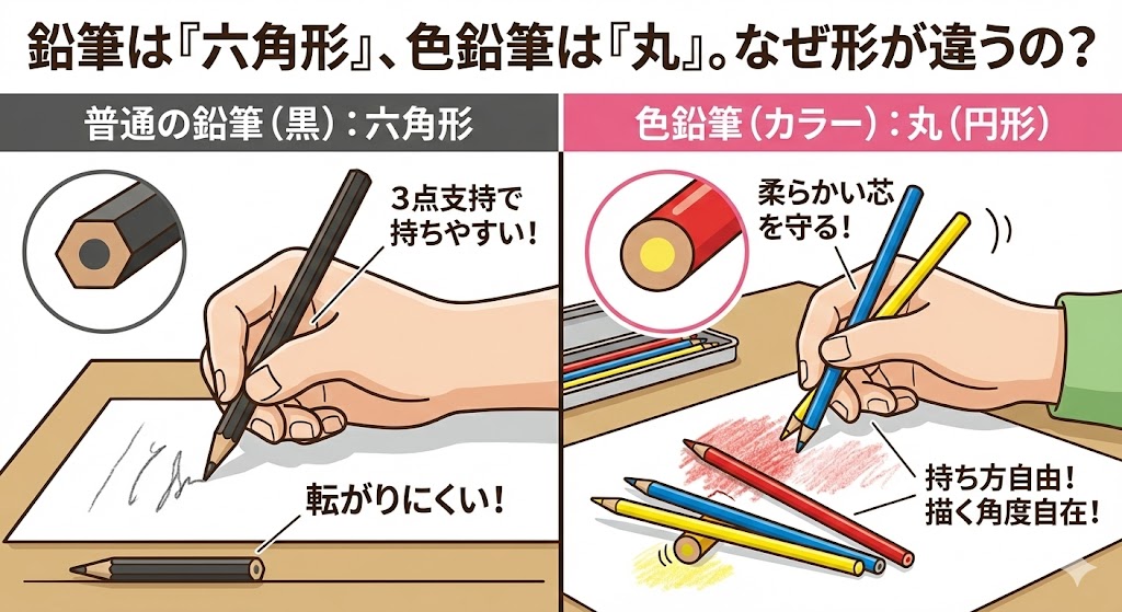 はじめに 小学生の頃からお世話になっている「鉛筆」と「色鉛筆」。 筆箱の中を思い出してみてください。 普通の鉛筆(黒): カクカクした「六角形」 色鉛筆: ツルツルした「丸(円形)」 どうして形が違うのでしょうか? 「色鉛筆も六角形の方が転がら... -