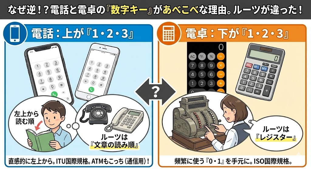はじめに 皆さんは、普段何気なく使っている「数字のキー」に、ある違和感を持ったことはありませんか? お手元のスマートフォンで、 「電話アプリ」のキーパッドと、 「電卓アプリ」のキーパッドを交互に開いてみてください。 電話: 上段が「1・2・3」(... -
