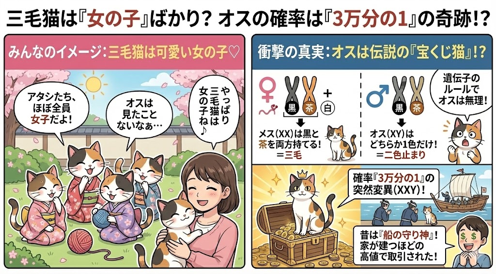 はじめに 2月22日は「ニャン・ニャン・ニャン」で「猫の日」。 猫といえば、日本猫の代表格である「三毛猫(みけねこ)」を思い浮かべる人も多いでしょう。 白・黒・茶色(オレンジ)の3色が混ざった、あの独特の模様です。 しかし、街で見かける三毛猫。 ... -