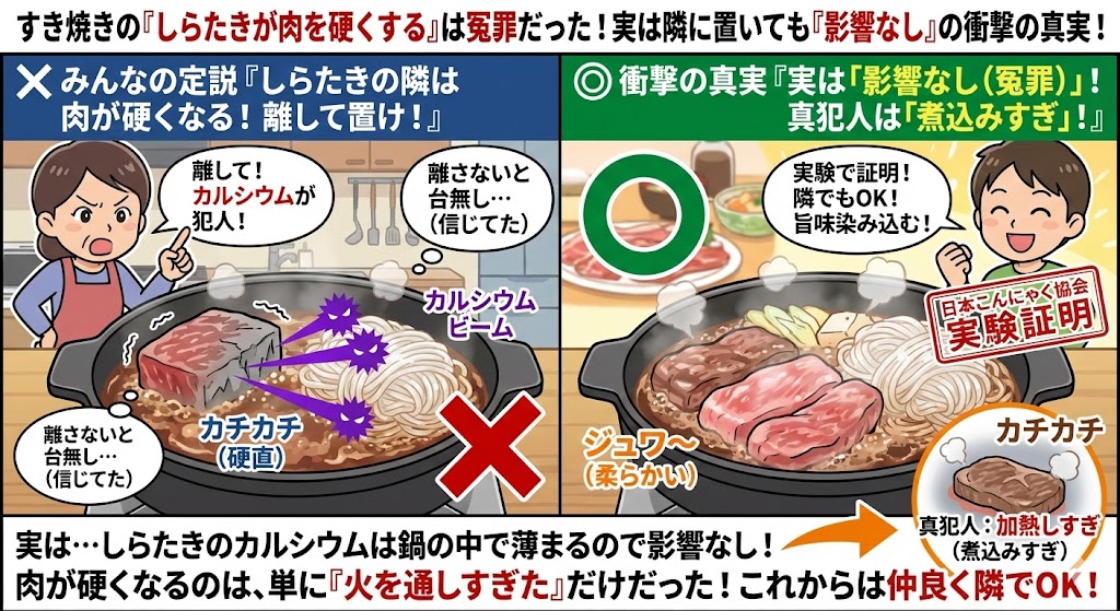 実は、すき焼きで「しらたき」の隣に肉を置いても硬くならない!長年信じられてきた常識は“冤罪”だった
