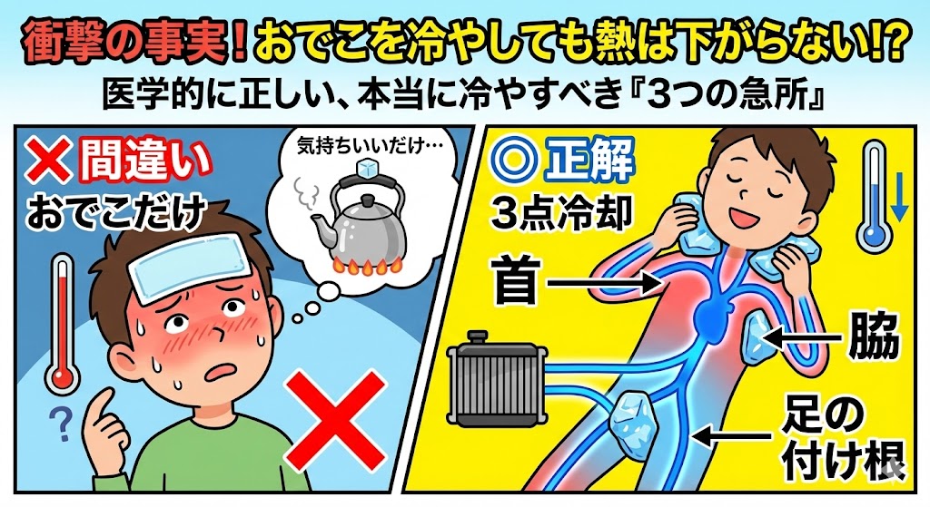 はじめに 風邪をひいて熱が出た時。 ドラマやアニメでもよく見る光景ですが、まず最初に「おでこ」に冷たい濡れタオルや、冷却シート(冷えピタなど)を貼りたくなりますよね。 「頭を冷やせば熱が下がるはず!」 そう信じて疑いませんが、実は医学的に言... -