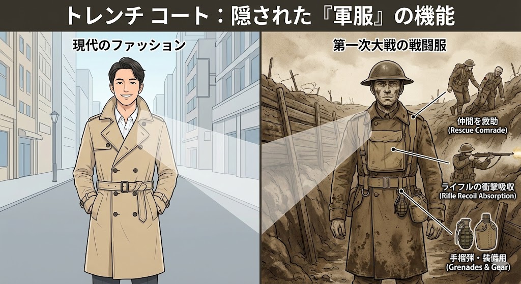 実は、トレンチコートは「塹壕(ざんごう)戦」の軍服だった!腰の金具は「手榴弾」用?オシャレなデザインに隠された血塗られた歴史
