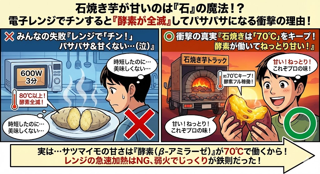 実は、焼き芋は「電子レンジ」で作ると甘くない!?石焼き芋が異常に甘いのは「70℃」をキープする魔法だった