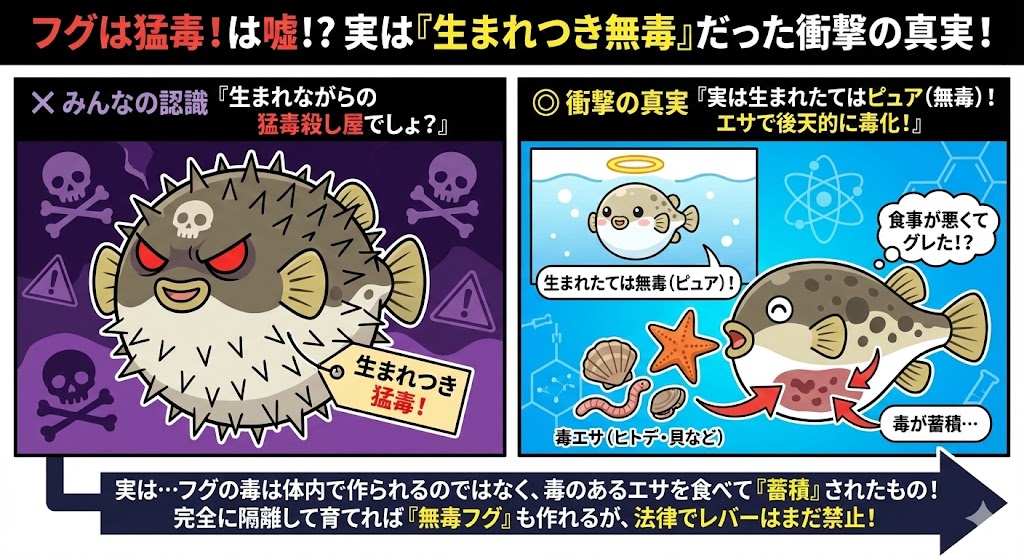 はじめに 冬の高級食材、「フグ」。 てっちり、てっさ、白子……淡白で上品な味わいは最高ですが、食べる時には常に「テトロドトキシン」という猛毒のリスクがつきまといます。 「当たれば死ぬ」と言われるほど怖い魚ですよね。 「あんな危険な毒を体内に持... -