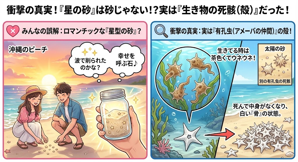 はじめに 沖縄の竹富島や西表島などのビーチで見られる「星の砂(星砂)」。 小さな星の形をしていて、幸せを呼ぶアイテムとして、小瓶に入れてお土産にする人も多いですよね。 「波に削られて、偶然星の形になったのかな?」 「ロマンチックだなあ」 とウ...